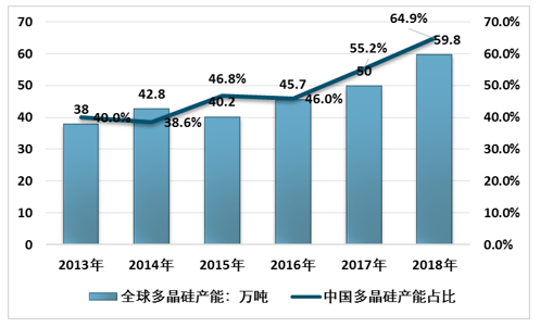 2013-2018年全球多晶硅产能和中国产能占比