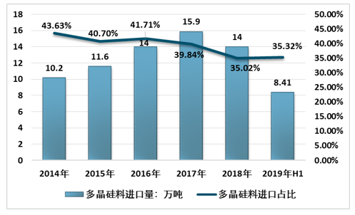 2014-2019年上半年中国多晶硅料进口量及进口占比