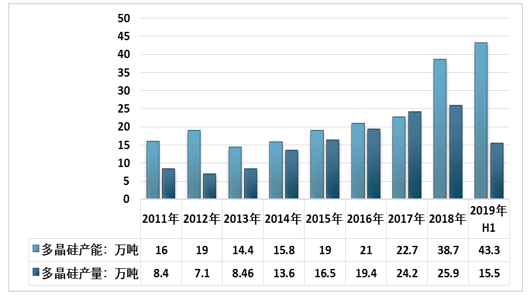 2011-2019年上半年中国多晶硅产能及产量统计